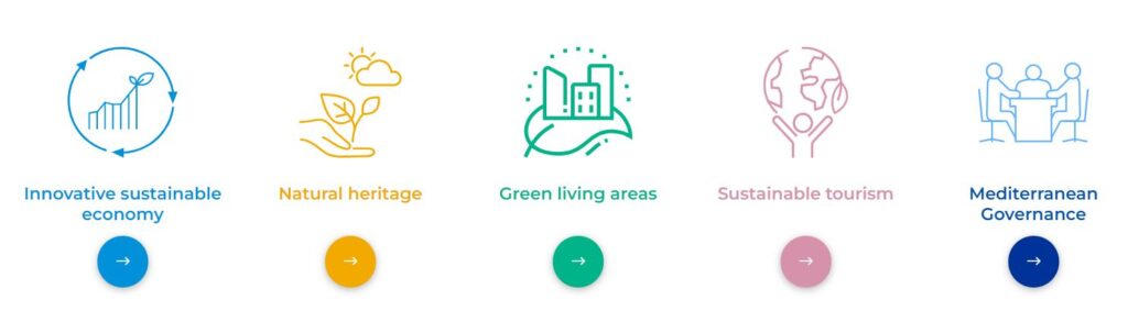 Las áreas temáticas prioritarias para Interreg Euro-Med son: economía innovadora y sostenible, patrimonio natural, áreas habitables verdes, turismo sostenible y gobernanza mediterránea.