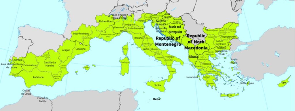 Otro rasgo peculiar es que sólo algunos países pueden participar, en concreto los de la región Mediterránea. Los países participantes son: Bulgaria, Croacia, Chipre, Francia, Grecia, Italia, Malta, Portugal, Eslovenia, España. Además de los países candidatos a la adhesión europea: Albania, Bosnia-Herzegovina, Montenegro y la República del norte de Macedonia. Dentro de cada país es interesante saber si la región es elegible o no para aplicar al programa. En el mapa inferior se reflejan precisamente las regiones elegibles de cada país.